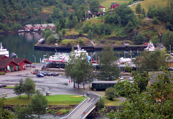 potem Flåm (tam gdzie kolejka wyjeżdża w górę po ścianie fiordu) i dopływają transatlantyki.